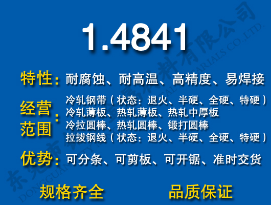 1.4841不銹鋼基本簡(jiǎn)介: 銘東金屬1.4841耐熱不銹鋼是高鉻鎳奧氏體不銹鋼,在氧化介質(zhì)中具有優(yōu)良的耐蝕性能,同時(shí)具有良好的高溫力學(xué)性能,因此它既可以用于耐蝕部件又可以用于高溫部件。具有很好的抗氧化性、耐腐蝕性,因?yàn)檩^高百分比的鉻和鎳,使得擁有好得多蠕變強(qiáng)度,在高溫下能持續(xù)作業(yè),具有良好的耐高溫性。 1.4841不銹鋼化學(xué)成分: 碳 C :≤0.20% 硅 Si:1.50-2.50% 錳 Mn:≤2.00% 硫 S :≤0.030% 磷 P :≤0.045% 鉻 Cr:24.00~26.00% 鎳 Ni:19.00~21.00% 1.4841不銹鋼特性: 1.4841不銹鋼具有較高的高溫強(qiáng)度,良好的抗氧化和抗腐蝕性能,良好的疲勞性能、斷裂韌性等綜合性能。鉻(Cr)含量高,具有良好耐氧化、耐腐蝕、耐酸堿、耐高溫性能,耐高溫鋼管專用于制造電熱爐管等場(chǎng)合。單一奧氏體組織,在各種溫度下具有良好的組織穩(wěn)定性和使用可靠性,是廣泛應(yīng)用于航空、航天、石油、化工、艦船的一種重要材料。 1.4841不銹鋼適用范圍: 抗氧化性比1.4828好。實(shí)際上多作為耐熱鋼使用,用于氫退絲高溫爐管制造。承受1035℃左右反復(fù)加熱的抗氧化鋼,爐用部件、噴嘴、燃燒室、汽車凈化裝置用材料。在高溫條件下,1.4841具有抗氧化性和足夠的高溫強(qiáng)度以及良好的耐熱性能。 1.4841不銹鋼力學(xué)性能: 抗拉強(qiáng)度σb (MPa):≥520; 條件屈服強(qiáng)度σ0.2 (MPa):≥205; 伸長(zhǎng)率δ5 (%):≥40; 斷面收縮率ψ(%):≥50; 硬度:HBS≤187;HRB≤90;HV≤200。 1.4841不銹鋼金相組織: 熱處理規(guī)范:固溶1040~1180℃快冷。 金相組織:組織特征為奧氏體型。 交貨狀態(tài):一般以熱處理狀態(tài)交貨,其熱處理種類在合同中注明;未注明者,按不熱處理狀態(tài)交貨。 1.4841不銹鋼交貨規(guī)格: 銘東金屬1.4841線材規(guī)格:Φ0.1~8.0mm; 銘東金屬1.4841圓棒規(guī)格:Φ8.0~350mm; 銘東金屬1.4841帶材規(guī)格:0.2~3.0mm; 銘東金屬1.4841板料規(guī)格:1.0~100mm。 |