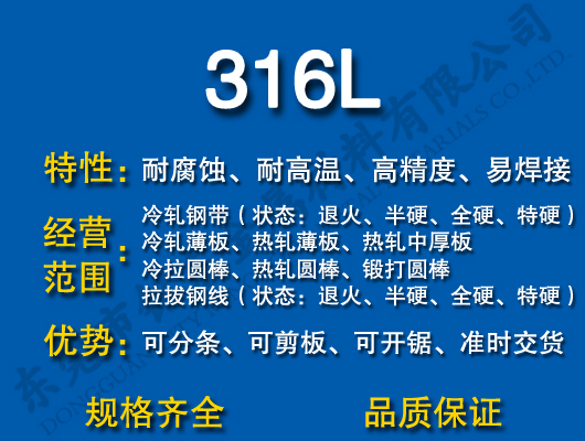銘東金屬316L是一種超低碳奧氏體不銹鋼鋼,316L比316耐晶間腐蝕性好。316L不銹鋼焊接性能良好,適合多層焊,焊后無刀口腐蝕傾向,對亞硫酸、硫酸、磷酸、醋酸、甲酸、氯鹽、鹵素、亞硫酸鹽均有良好的耐蝕性。該不銹鋼有良好的冷、熱加工性能,鋼的熱塑性良好,過熱敏感性低,適宜的熱加工溫度為900~1000℃。