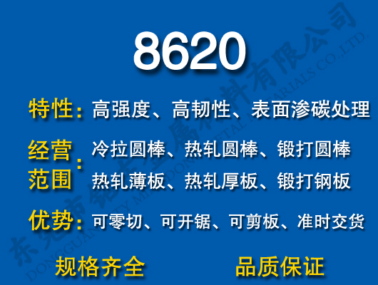 銘東金屬8620是一種常用的合金滲碳鋼,滲碳處理后表面有相當(dāng)高的硬度、耐磨性和接觸疲勞強(qiáng)度,同時(shí)心部還保留良好的韌性,能承受高的沖擊負(fù)荷。8620主要用作汽車軸承等耐沖擊、耐磨損零件的材料。