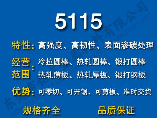 銘東金屬5115是滲碳鋼,滲碳鋼通常為含碳量為0.15%-0.24%的低碳鋼。汽車上多用其制造傳動(dòng)齒輪,是中淬透性滲碳鋼,其淬透性較高,在保證淬透情況下,特別是具有較高的低溫沖擊韌性。5115適合做表面滲碳硬化處理,具有良好的加工性,加工變形微小,抗疲勞性能相當(dāng)好。廣泛應(yīng)用于軸類,活塞類零配件以及汽車,飛機(jī)各種特殊零件部位。