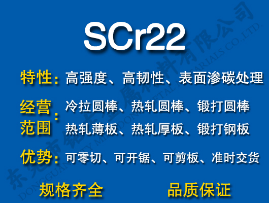 SCr22含有適量的合金元素同時含碳量在0.2%左右,滲碳處理后表面有較高的硬度,心部也具有極佳的韌性,廣泛用于鍋爐及汽輪機制造業(yè)中作隔板、葉片、鍛件、型扎材、化工工業(yè)中制造高壓管及各種緊固件,機械制造業(yè)中制作較高級的滲碳零件,如齒輪、軸等。