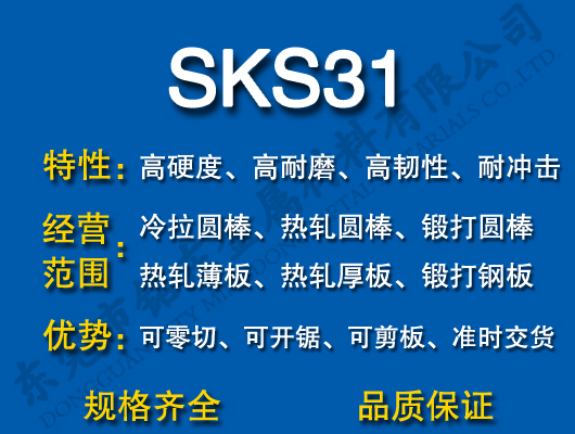 銘東金屬SKS31為鉻,錳及釩為主之油淬合金鋼材,有硬化能力及深度性佳,抗磨損不變形,可作電蝕操作。用作一切切割模具,如冷沖模,剪口模,印花模,塑膠模,絲攻及螺絲板模,木工切削刀具等。