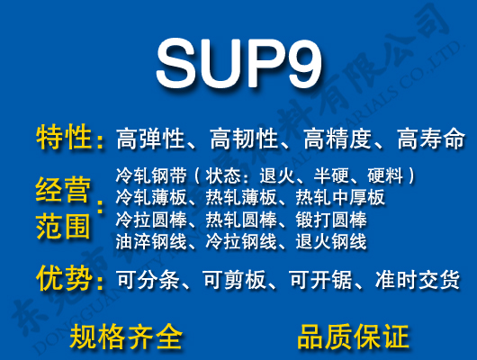 SUP9彈簧鋼廣泛應(yīng)用于汽車懸架鋼板彈簧的制造、高速重載機(jī)車用彈簧等較大截面的高負(fù)荷重要彈簧及工作溫度<300℃的閥門彈簧、活塞彈簧、安全閥彈簧,使用溫度不超過(guò)400℃。