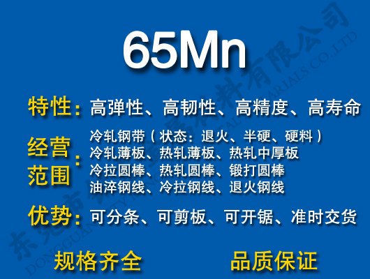 65Mn彈簧鋼簡(jiǎn)介: 銘東金屬65Mn屬于高精度碳素彈簧鋼,具有優(yōu)良的冶金質(zhì)量(高的純潔度和均勻性)、良好的表面質(zhì)量(嚴(yán)格控制表面缺陷和脫碳)、精確的外形和尺寸。該鋼經(jīng)熱處理或冷拔硬化后,強(qiáng)度、硬度、彈性和淬透性均比65鋼稍高,在相同表面狀態(tài)和完全淬透情況下,疲勞極限與合金彈簧鋼相當(dāng)。該鋼具有過熱敏感性和回火脆性傾向,水淬有形成裂紋傾向,一般采用油淬。退火態(tài)可切削性尚可,冷變形塑性低,焊接性差。 65Mn彈簧鋼化學(xué)成分: 碳 C:0.62~0.70% 硅 Si:0.17~0.37% 錳 Mn:0.90~1.20% 磷 P:≤0.035% 硫 S:≤0.040% 鉻 Cr:≤0.25% 鎳 Ni:≤0.25% 銅 Cu:≤0.25% 65Mn彈簧鋼力學(xué)性能: 密度ρ(kg/m³):約7850; 抗拉強(qiáng)度σb (MPa):≥980(淬火),≥735(正火); 屈服強(qiáng)度 σs (MPa):≥784(淬火),≥430(正火); 伸長(zhǎng)率 δ5 (%):≥8(淬火),≥9(正火); 斷面收縮率ψ (%):≥30(正火); 布氏硬度(HBS10/3000)(退火狀態(tài)):≦285(未熱處理),≦229(退火); 試樣尺寸:試樣毛坯尺寸為25mm 65Mn彈簧鋼熱處理規(guī)范及交貨狀態(tài): 熱處理規(guī)范:淬火830℃±20℃,油冷;回火540℃±50℃(特殊需要時(shí),±30℃); 金相組織:屈氏體; 臨界點(diǎn)溫度(近似值)Ac1=726℃,Ac3=765℃,Ar3=741℃,Ar1=689℃,Ms=270℃; 正火規(guī)范:溫度810±10℃,空氣冷卻; 交貨狀態(tài):熱軋鋼材以熱處理或不熱處理狀態(tài)交貨,冷軋鋼材以熱處理或退火狀態(tài)交貨,冷拉鋼材以不熱處理或退火狀態(tài)交貨。 65Mn彈簧鋼特性及適用范圍: 65Mn彈簧鋼具有優(yōu)良的綜合性能,如力學(xué)性能(特別是彈性極限、強(qiáng)度極限、屈強(qiáng)比)、抗彈減性能(即抗彈性減退性能,又稱抗松弛性能)、疲勞性能、淬透性、物理化學(xué)性能(耐熱、耐低溫、抗氧化、耐腐蝕等)。適合用于制造受中等載荷的板彈簧,直徑達(dá)7-20mm的螺旋彈簧及彈簧墊圈、彈簧環(huán)。高耐磨性零件,如磨床主軸、彈簧卡頭、精密機(jī)床絲桿、犁、切刀、螺旋輥?zhàn)虞S承上的套環(huán)、鐵道鋼軌等。 65Mn彈簧鋼交貨規(guī)格: 銘東金屬65Mn冷軋鋼帶交貨規(guī)格:0.15~2.0mm; 銘東金屬65Mn冷軋鋼板交貨規(guī)格:1.0~4.0mm; 銘東金屬65Mn熱軋鋼板交貨規(guī)格:3.0~20.0mm; 銘東金屬65Mn冷拉圓棒交貨規(guī)格:Φ4.0~Φ16.0mm; 銘東金屬65Mn熱軋圓棒交貨規(guī)格:Φ16~Φ350mm; 銘東金屬65Mn油淬鋼線交貨規(guī)格:Φ1.0~Φ15mm。 |