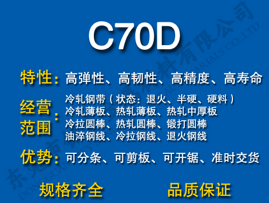 銘東金屬C70D屬于高精度碳素彈簧鋼,具有優(yōu)良的冶金質(zhì)量(高的純潔度和均勻性)、良好的表面質(zhì)量(嚴(yán)格控制表面缺陷和脫碳)、精確的外形和尺寸。經(jīng)熱處理或冷拔硬化后,可得到較高的強(qiáng)度、硬度、彈性和適當(dāng)?shù)捻g性、塑性,在相同表面狀態(tài)和完全淬透情況下,疲勞極限不比合金彈簧鋼差。不過跟合金彈簧鋼相比,C70D鋼淬透性一般,尺寸較小可以采用油淬或者水淬,尺寸較大時油中淬不透,水淬則變形,開裂傾向較大,大截面零件一般采用水淬油冷或正火處理進(jìn)行硬化,所以該鋼廣泛適用于制造較小尺寸的彈簧。